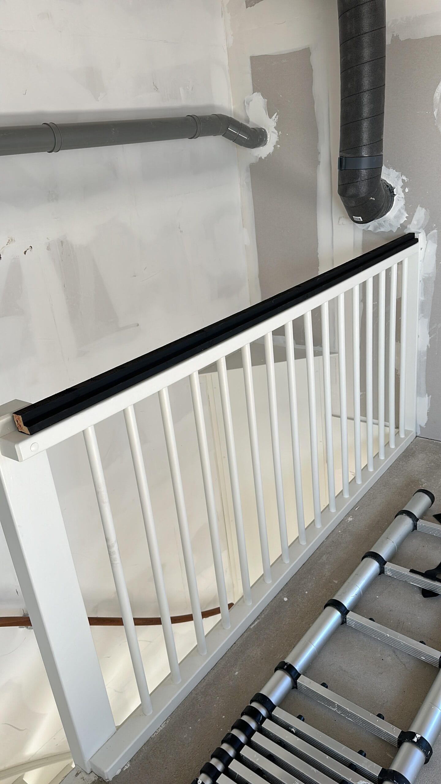 Bij dit project is een traditionele trap met spijlen volledig vernieuwd door de plaatsing van een strakke trap met glaswand. Waar eerst witte houten spijlen stonden, is nu gekozen voor een doorlopende glazen afscheiding met een zwart stalen profiel. Het resultaat is een moderne, veilige en onderhoudsvriendelijke oplossing die perfect past in een eigentijds interieur.