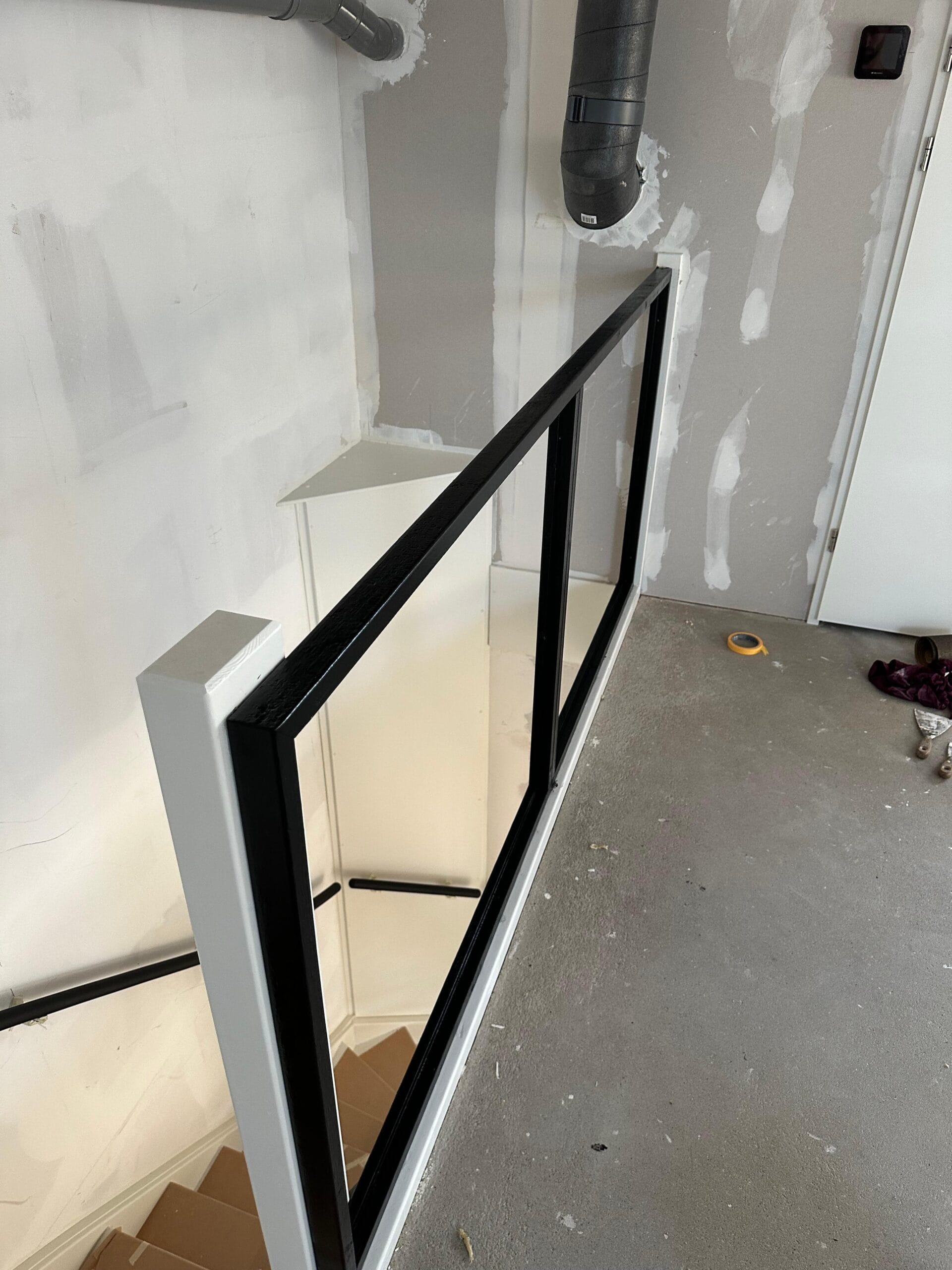 Eerst zijn de oude spijlen zorgvuldig verwijderd. Vervolgens is er een nieuw frame geplaatst waarin de glaspanelen naadloos zijn bevestigd. De keuze voor een zwart profiel geeft een modern en industrieel karakter, dat uitstekend combineert met de witte wanden en plafonds. Het glas zelf is veiligheidsglas, wat betekent dat het extra stevig is en bestand tegen intensief gebruik.